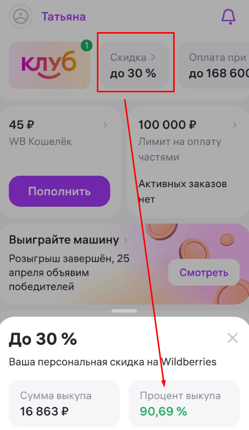 Чтобы узнать свой процент выкупа на Вайлдберриз, не нужно считать всё вручную. Покупателю достаточно зайти в свой аккаунт на сайте или в приложении маркетплейса. Здесь будет указана скидка постоянного покупателя, сумма выкупа и процент выкупа за последние 2 года.