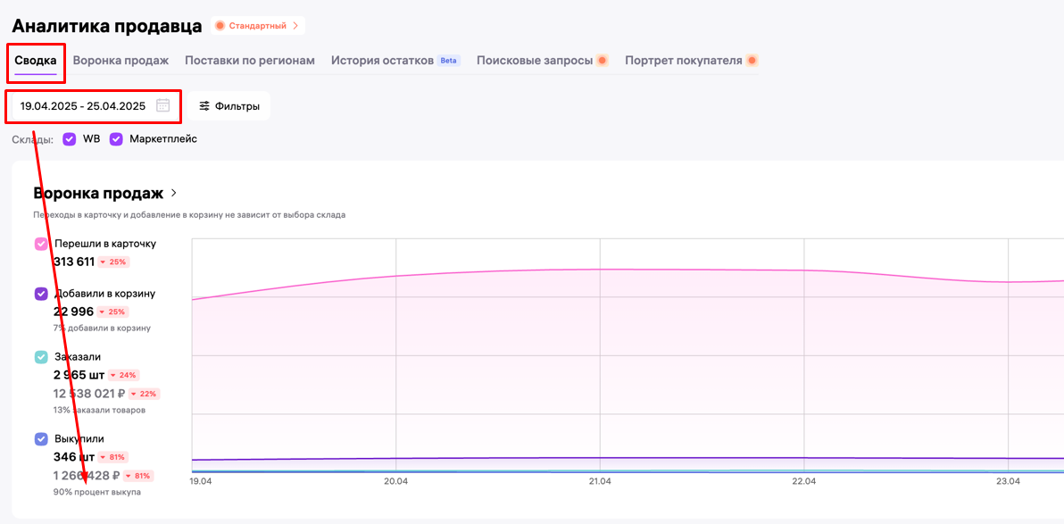 Например, заказано на 25 000 рублей, выкупили на 20 000. Считаем 20 000/25 000 * 100= 80%. Селлер может посмотреть данный показатель за выбранный период в разделе Аналитика на вкладке Сводка в личном кабинете. По умолчанию здесь выводятся данные за последнюю неделю, но можно выбрать другой период, а также смотреть выкуп по складам WB и по своим складам.