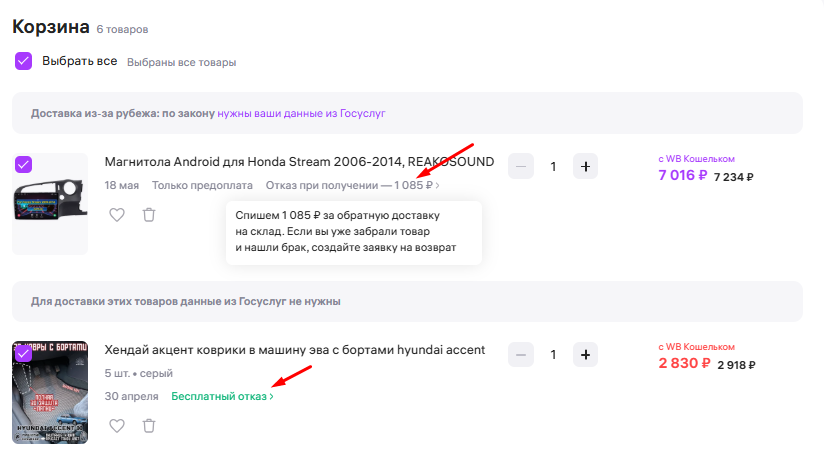 Маркетплейс не меньше продавцов заинтересован в повышении процента выкупа. WB сократил долю товаров с бесплатными возвратами, чтобы подстегнуть пользователей к более осознанным покупкам. Например, покупателям придется платить за отказ от товаров, которые доставляются из-за рубежа, а также с отдаленных складов.