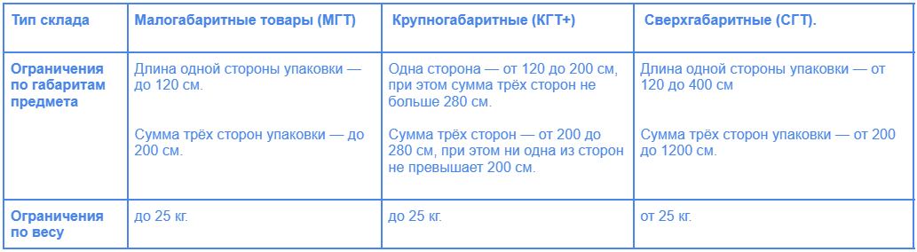 Если ваши товары не умещаются в подобные грузовые места, отправлять их можно только через склады КГТ и СГТ — для них действуют свои стандарты упаковки.