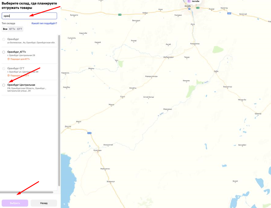 Подходящий склад WB можно найти также через строку поиска: просто начните набирать название города, в котором находится ваш физический склад и нажмите кнопку выбрать.