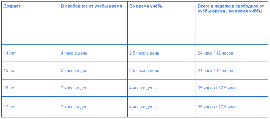 Подростки не могут работать наравне со взрослыми, для них предусмотрен сокращенный рабочий день. В зависимости от возраста он составляет от 4 до 7 часов в день. Кроме того, несовершеннолетних работников запрещено привлекать к труду сверхурочно, ночью, в выходные и праздничные дни.